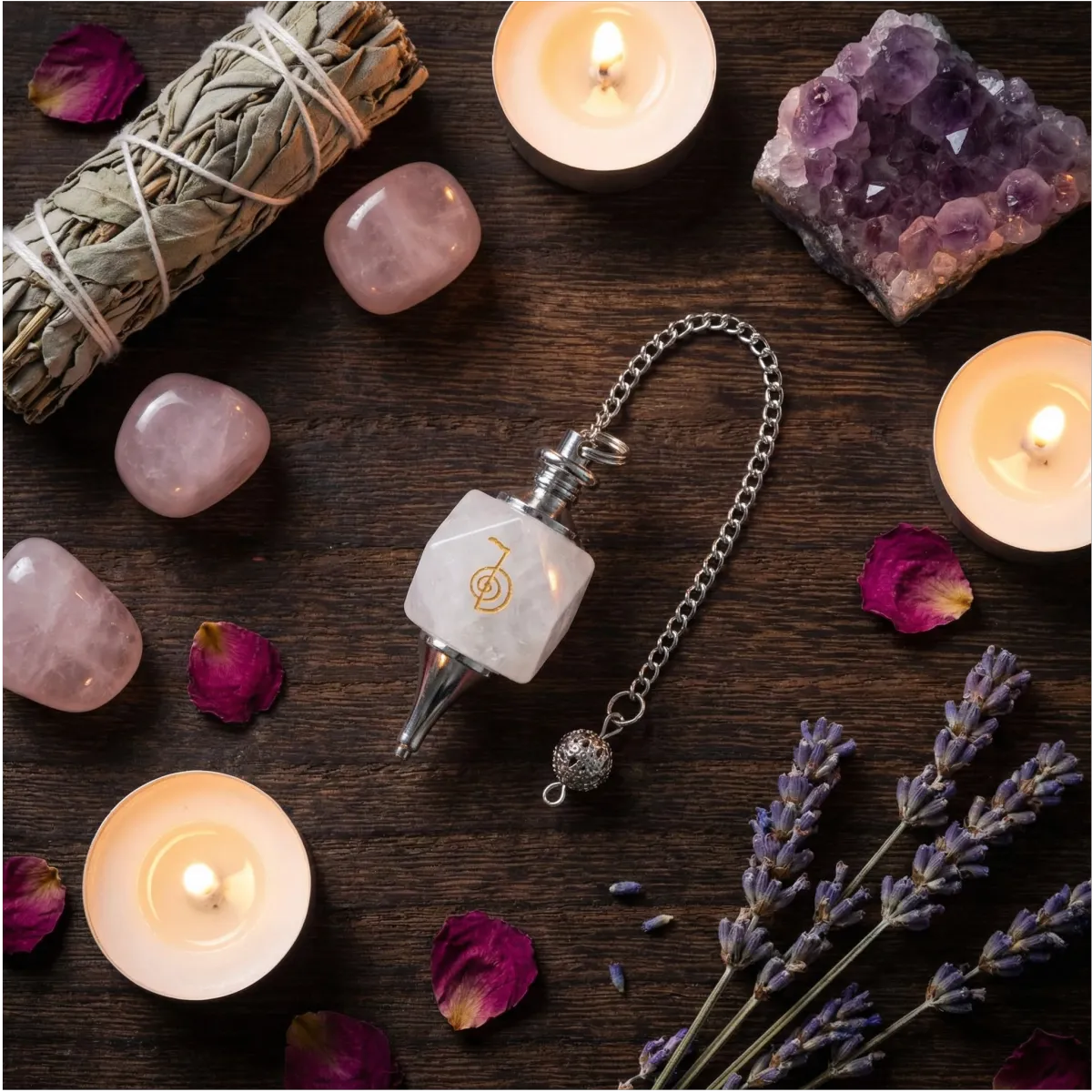 為什麼適合初學者? 它是全頻率的擴大機,最為中立、不帶偏見。對於靈擺小白來說,白水晶就像一張白紙,能最誠實地反映潛意識的微小震動,且能量純粹,不會造成初學者能量過載的負擔。刻上一階符號後,能穩定物理場,強化靈擺「顯像」功能。